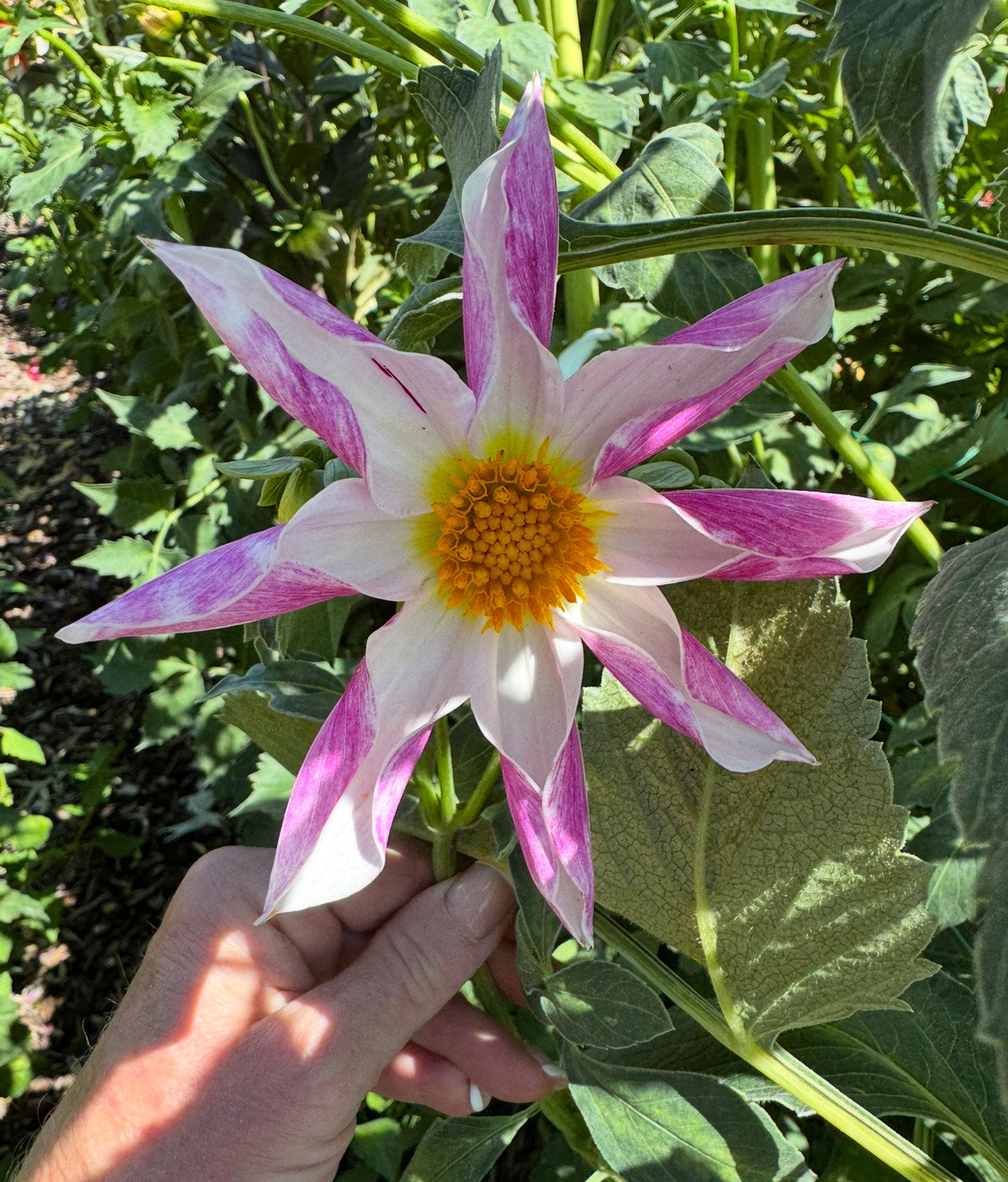 Mingus Art. This orchid style 3.5″ bloom has white petals that fold forward exposing a pink back of petal with yellow centers. 4′ bushy form.