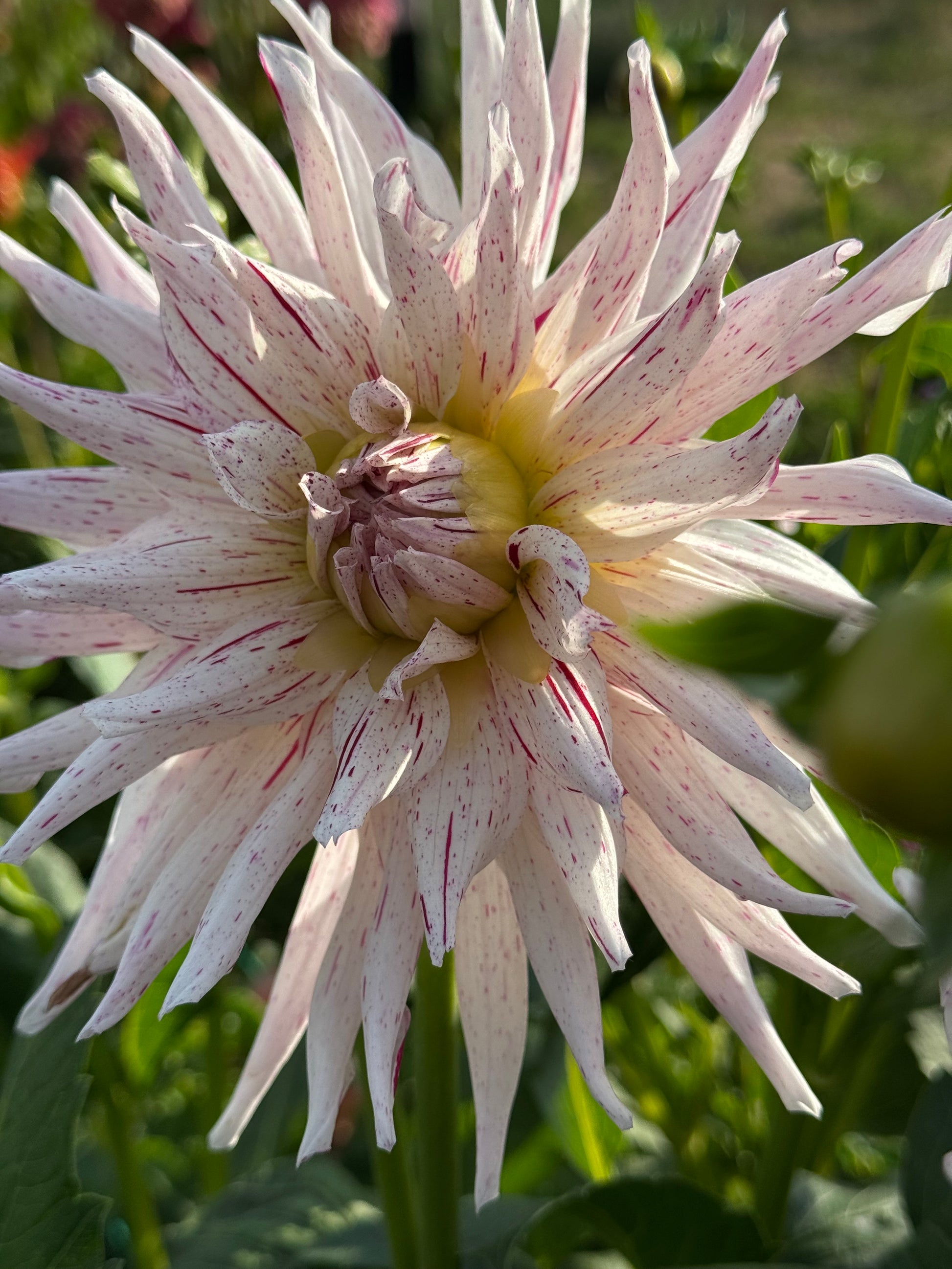 Mingus Christopher dahlia is a striking variety. Semi Cactus variety with red striations. Dark Foliage, Tall plant, petals are often fringed and curled and full making it an excellent choice in floral arrangements.