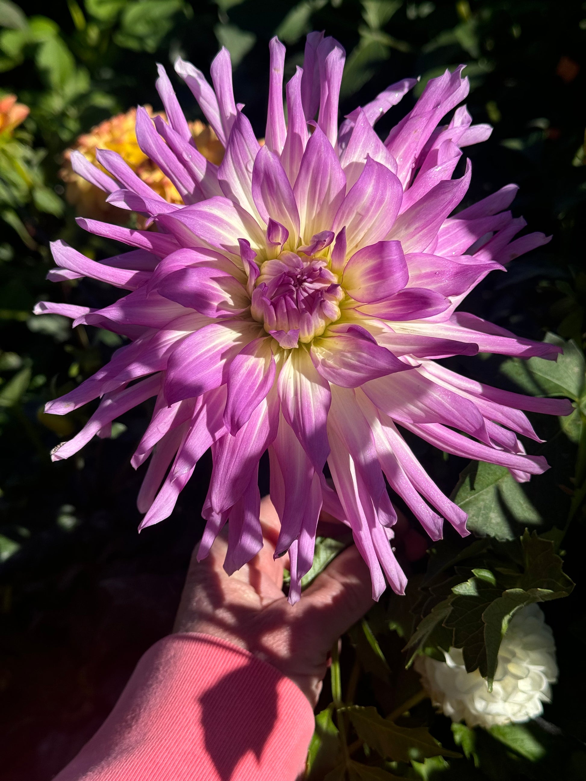 Dahlia 'Mingus Randy' is a refreshing Semi-cactus form with cool white petals tipped in bright lavender purple. These impressive 9–10′′ blooms are beautiful with similar hues in a vase.