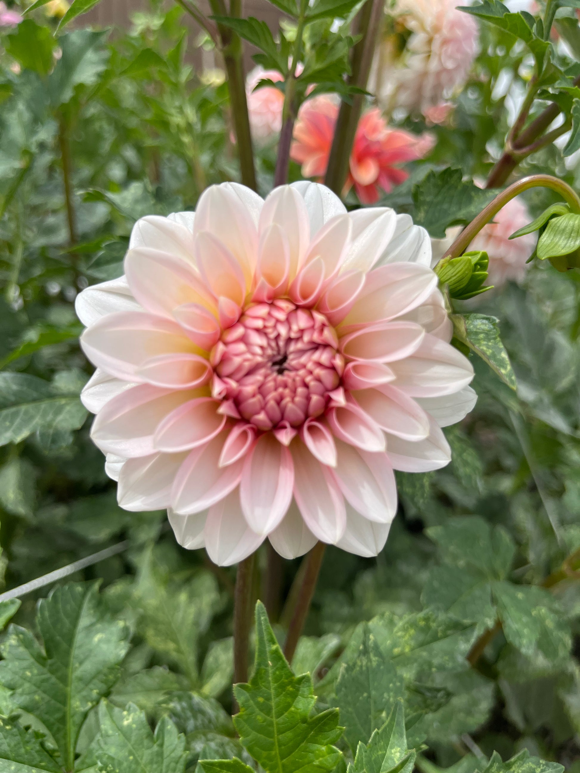 Dahlia ‘RM Baby Girl’ produces charming, fully double blooms in soft blush pink with delicate creamy undertones, creating a gentle, romantic look in the garden. Flowers measure approximately 3–4 inches across and are held on strong, upright stems above fresh green foliage. Plants reach 36–40 inches in height and bloom steadily from mid-summer through frost.